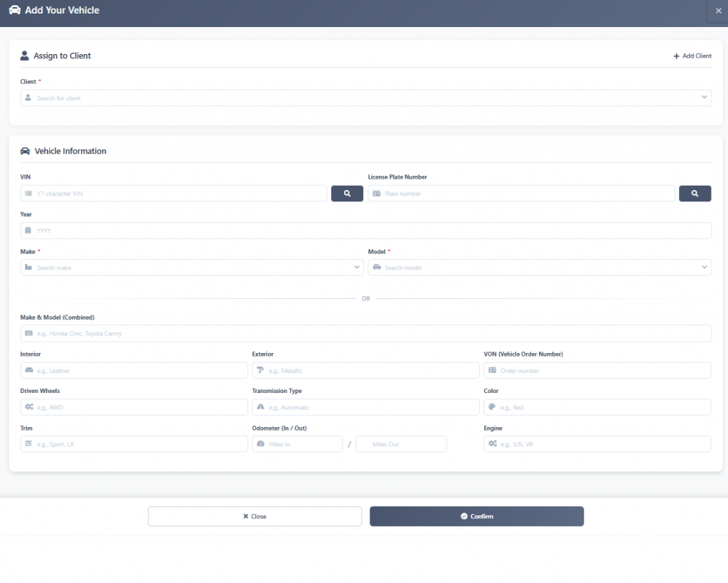 After entering the client’s vehicle information into the appropriate fields, click on the ‘Confirm’ button.