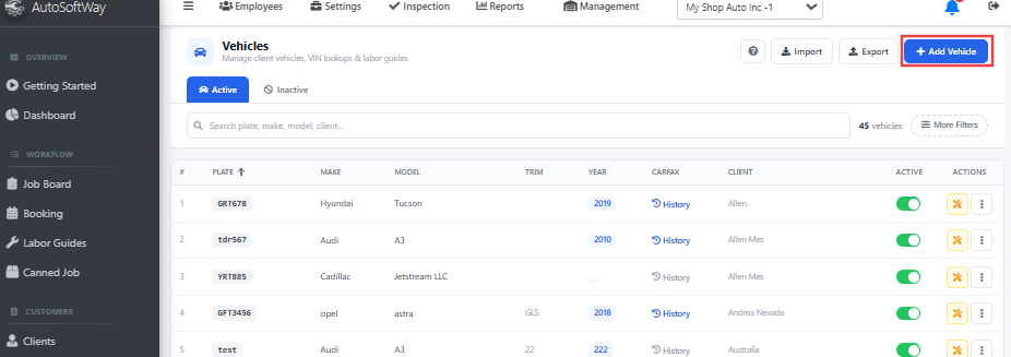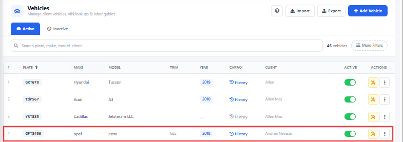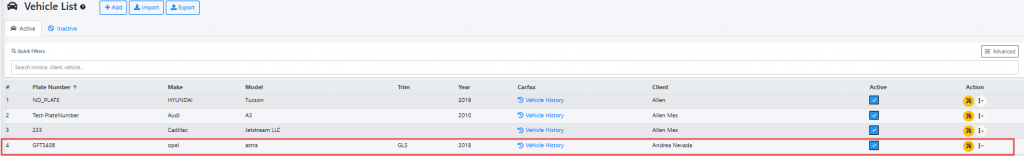 Your newly entered client’s vehicle should now be visible in the Vehicle List menu page.