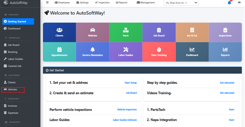 Starting from the ‘Welcome to AutoSoftWay’ page, navigate to the side bar, and click on the ‘Vehicles’ tab.