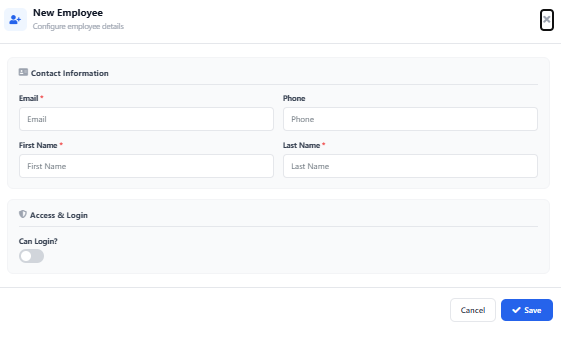 A pop up window should display empty fields for a new employee. Proceed to fill these fields with your employee’s information.