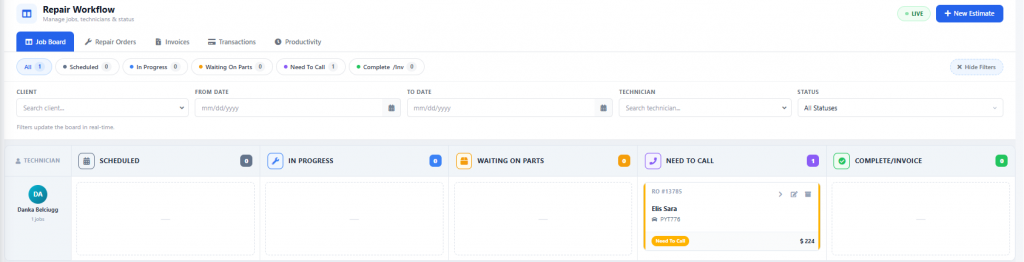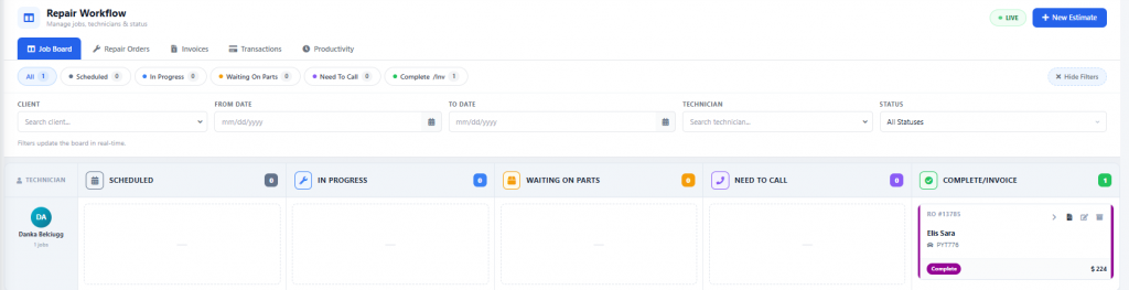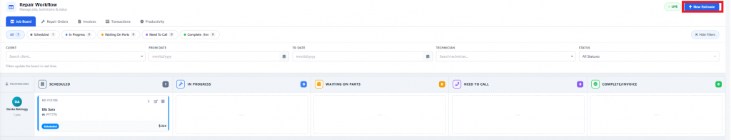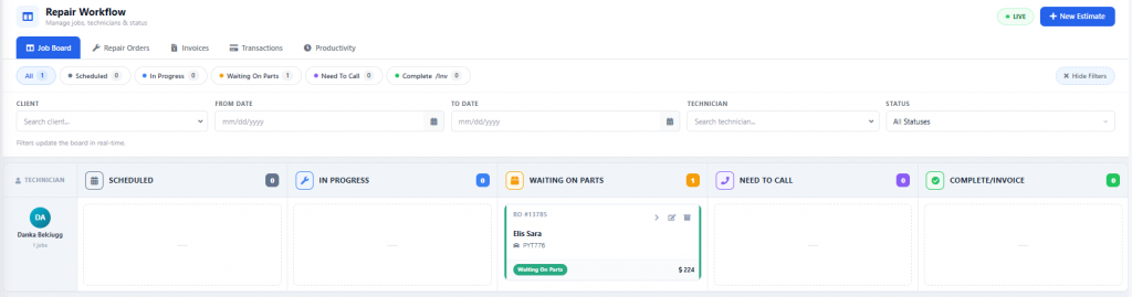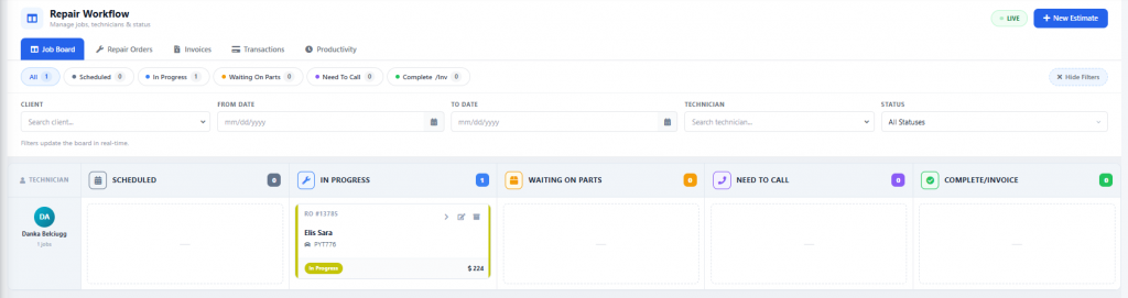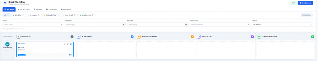 Once your assigned mechanic begins working on the client’s vehicle, update the order by dragging it from the scheduled into the in-progress column.
