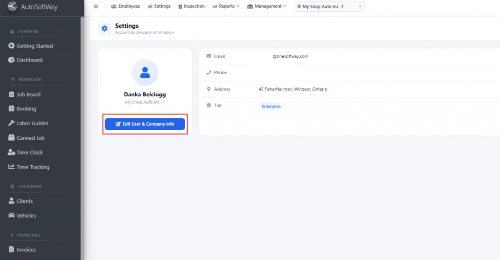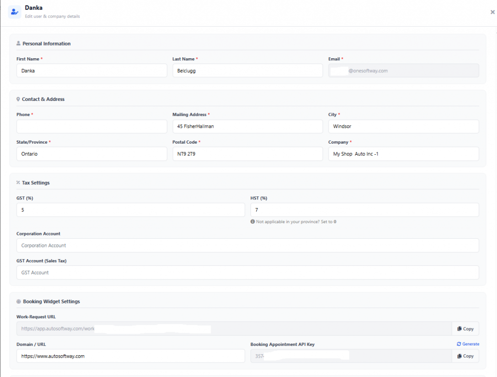 The data-api-key value can be found in your Management, then click ‘Company Profile’ and finally click Edit User and Company Info, and locate the API Key. Copy this key and paste it into the script to properly link your booking widget to your shop. The URL refers to your auto repair shop’s website where the widget will be embedded.