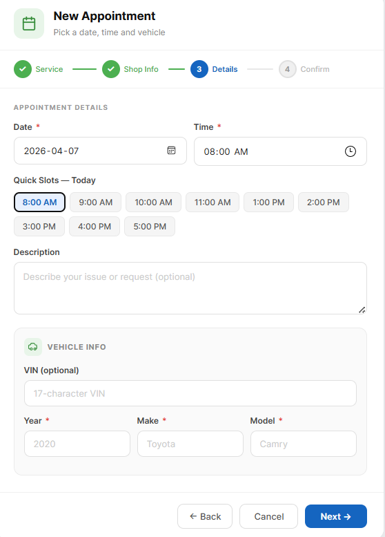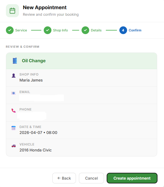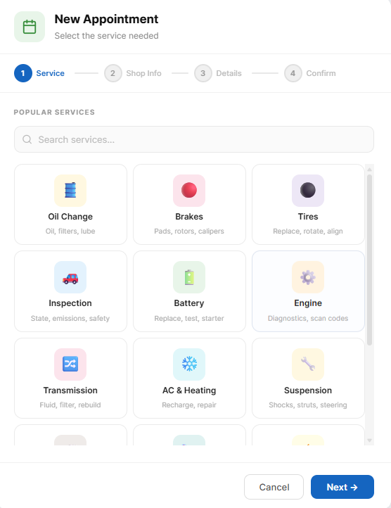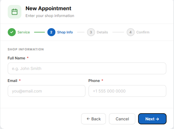 Embed a responsive appointment booking widget directly into your auto repair shop’s website. Enable real-time scheduling with service selection, time slot availability, and instant confirmation, streamlining customer intake without phone calls.