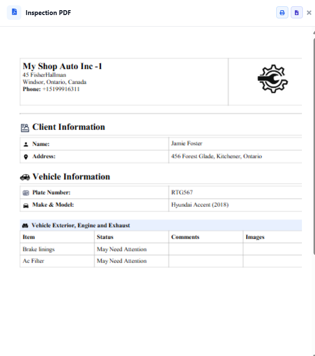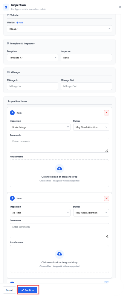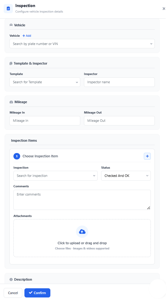 After selecting the appropriate inspection template, the fields will automatically populate the inspected items. Add a description to the inspection report that includes all relevant details about the customer, vehicle, and inspection process. You can also upload images for each inspected item. Once everything is complete, click ‘Confirm’ to save the report.