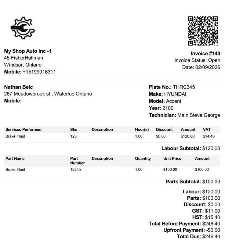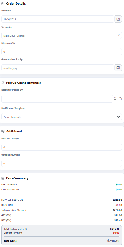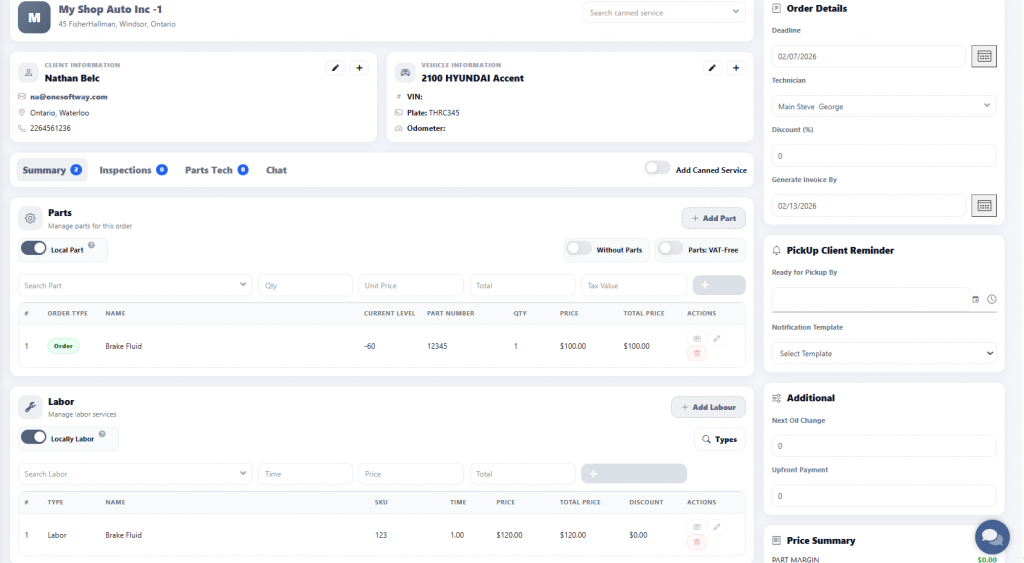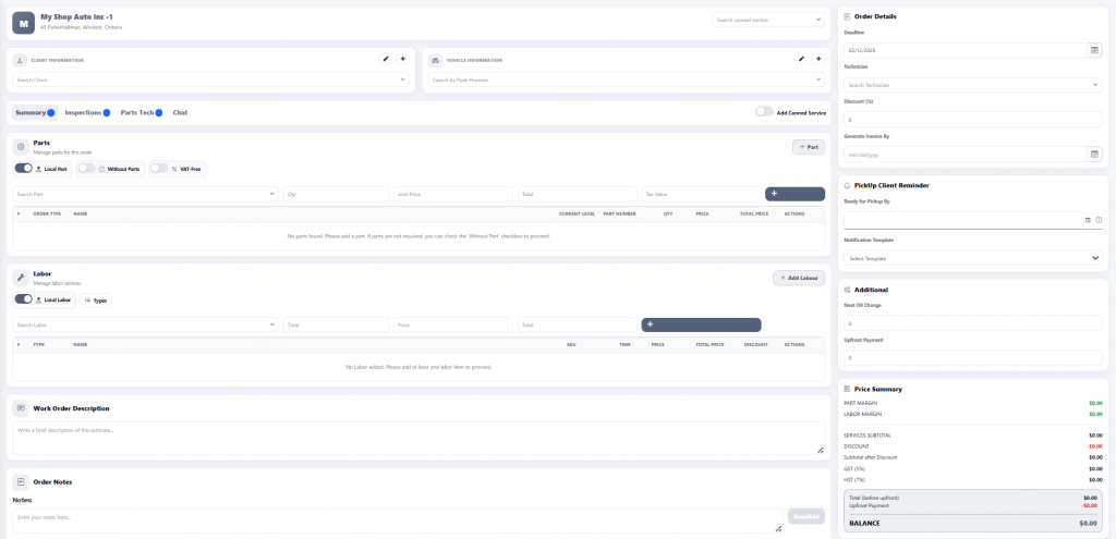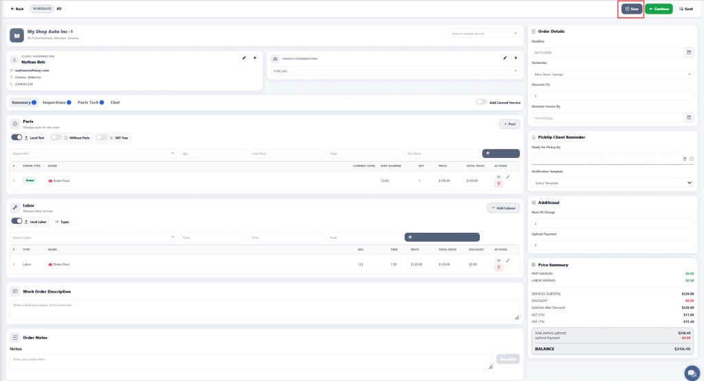 The total costs for parts and labour are displayed below, and taxes are calculated automatically.