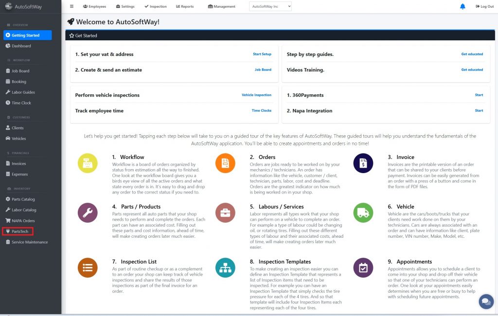 Starting from the Getting Started, navigate to Features Menu, and click on the ‘ Parts Tech’