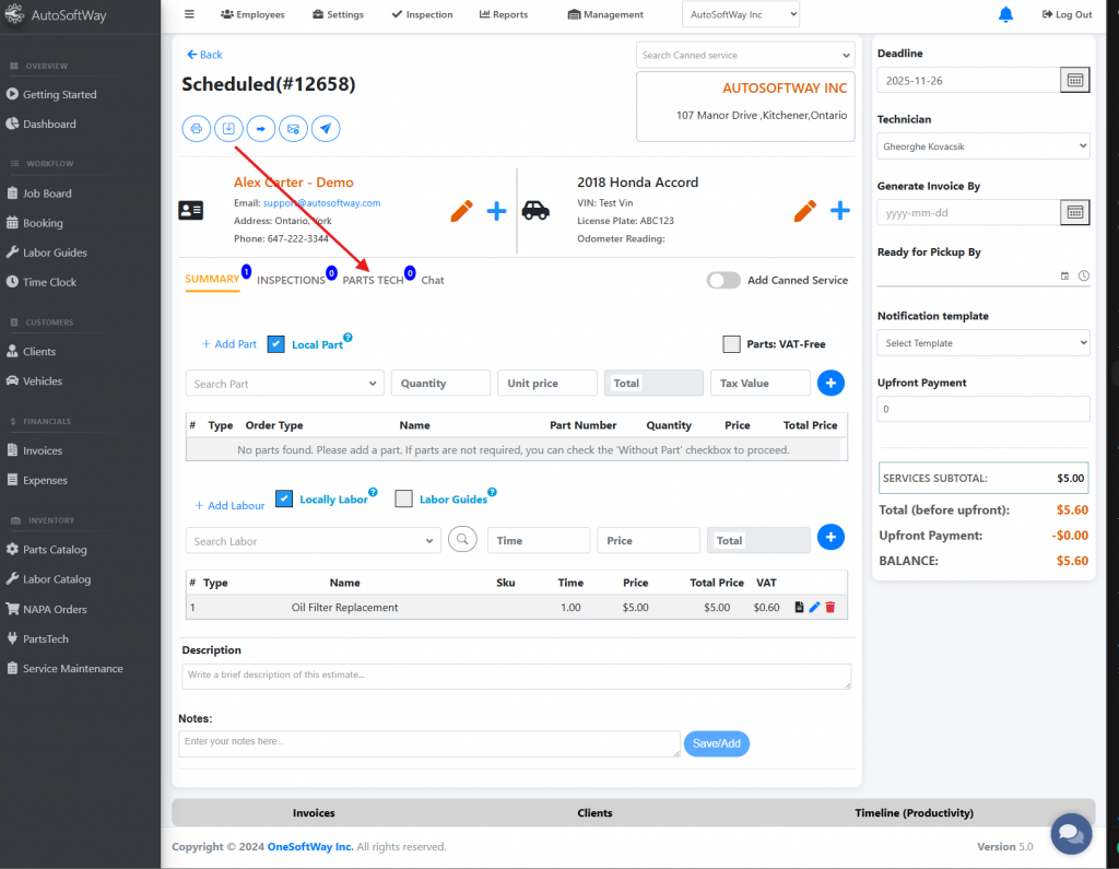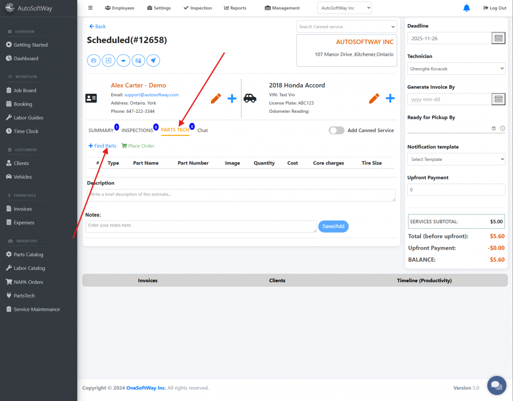 Click ‘Find Parts’ to search and order parts directly from PartsTech.