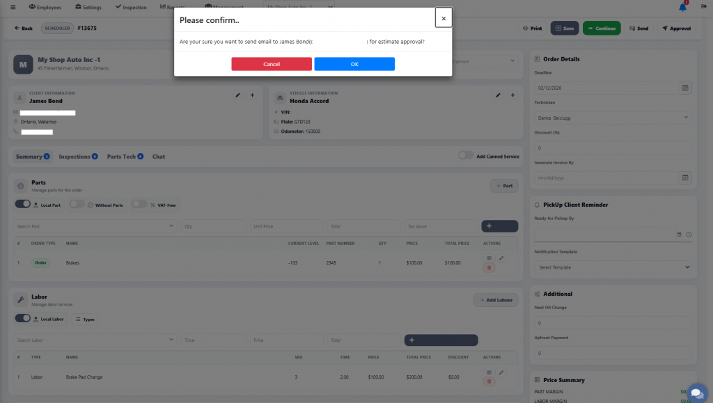 A pop-up window will appear to confirm the client’s email address. If the email is correct, click ‘OK’ to send the estimate for approval.