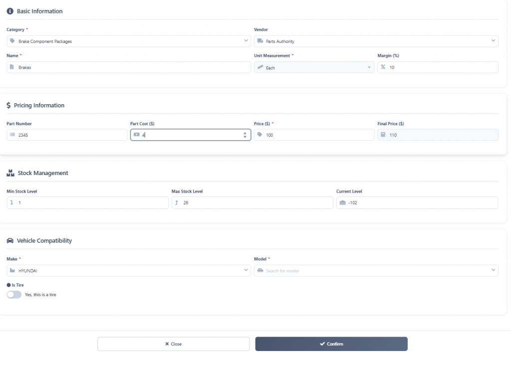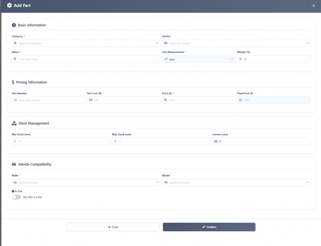 A pop up window should display empty fields for new car parts. Proceed to fill these fields with the appropriate information.