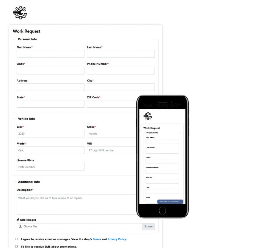 With AutoSoftWay, your shop can now embed the work request form directly into your website. This makes it simple for customers to request service anytime, whether they’re using their phone, tablet, or laptop. By giving your clients a quick and convenient way to submit work requests online, you’ll streamline communication, save time, and provide a professional, modern experience that keeps them coming back.