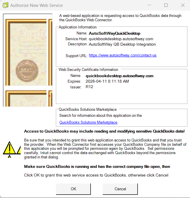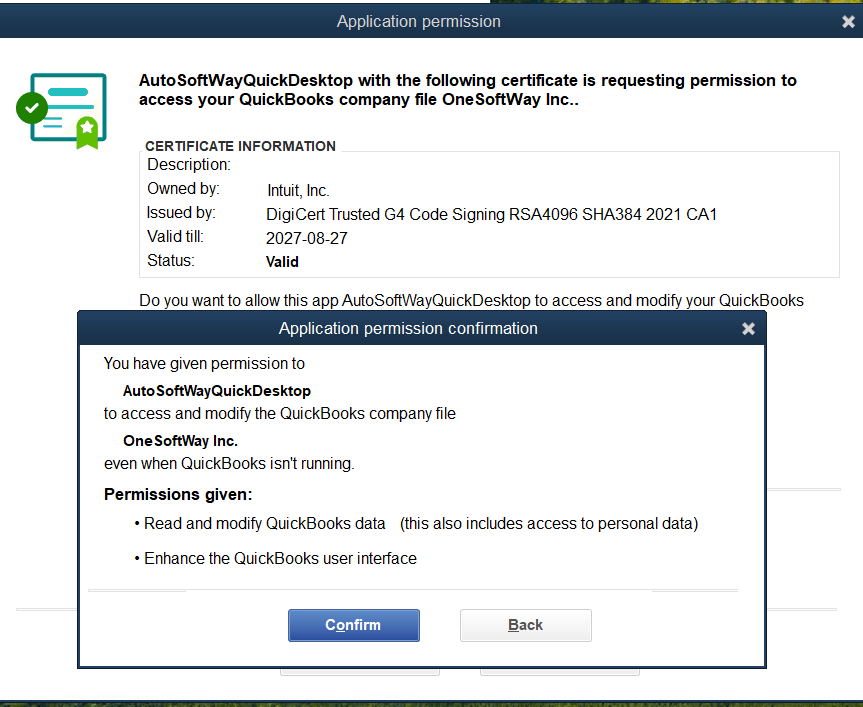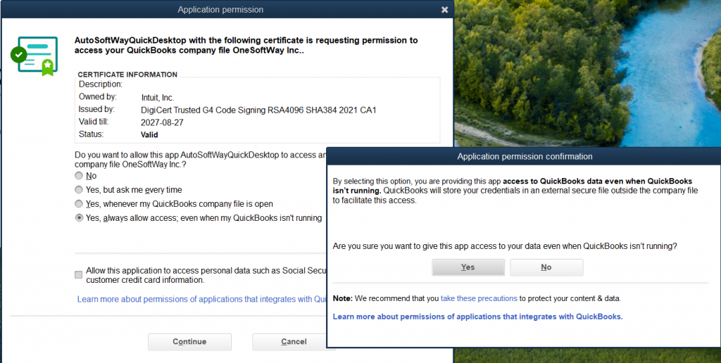 - After clicking OK, you’ll be prompted to grant permission to access QuickBooks. Select Yes, then confirm to continue.