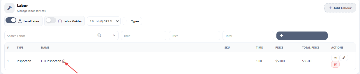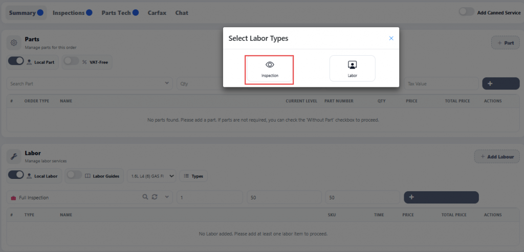 To start an inspection: Scroll to the labor section, click Search, and select Inspection. The technician must complete the required inspection items and templates to start the inspection.