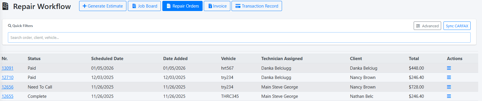 The repair workflow provides a clear view of all essential details for efficient tracking and management: